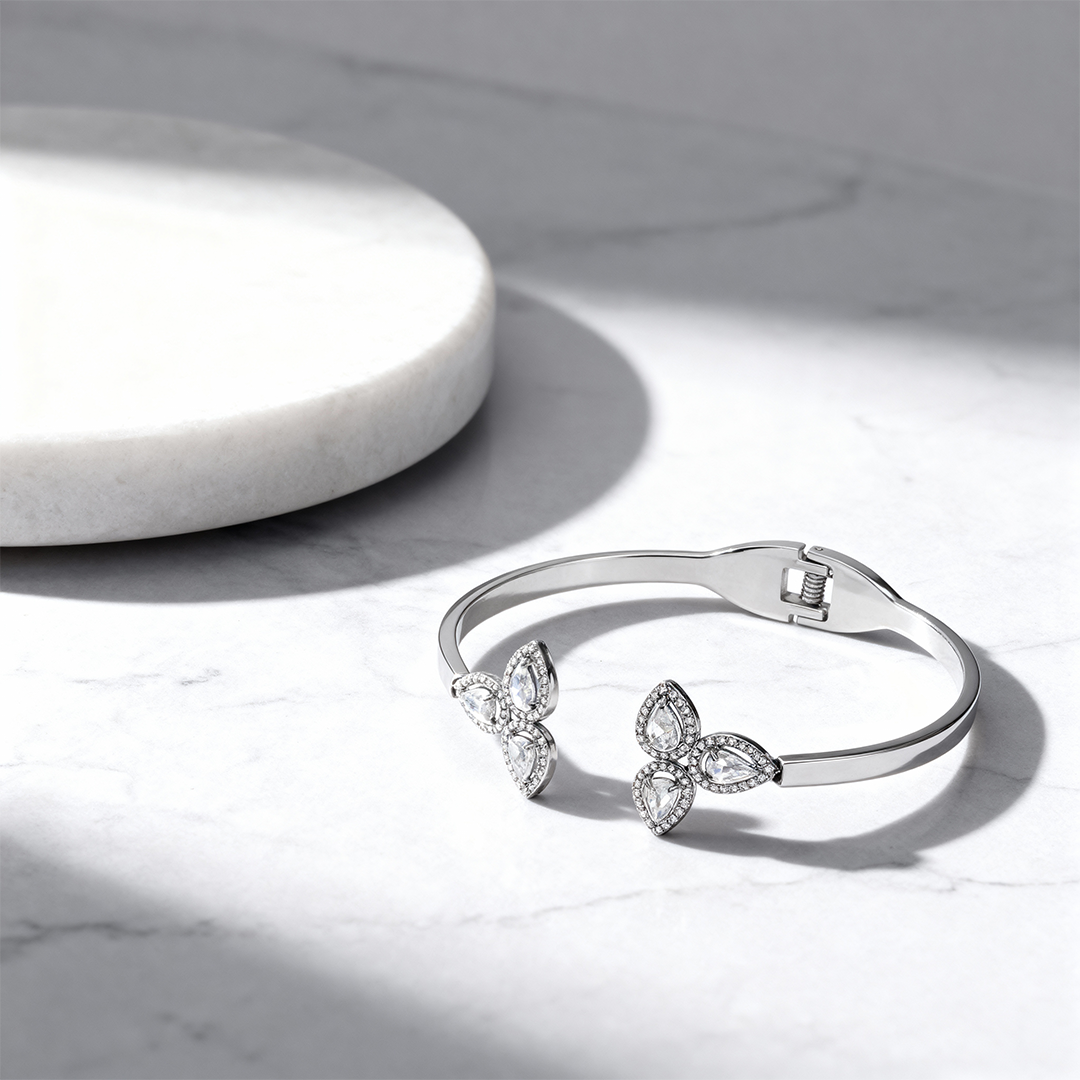 Add a touch of sparkling elegance to your everyday style with the Crystal Blossom Open Bangle Bracelet. Designed with delicate pear-shaped crystals arranged in a beautiful floral pattern, this piece blends sophistication with modern minimalism.